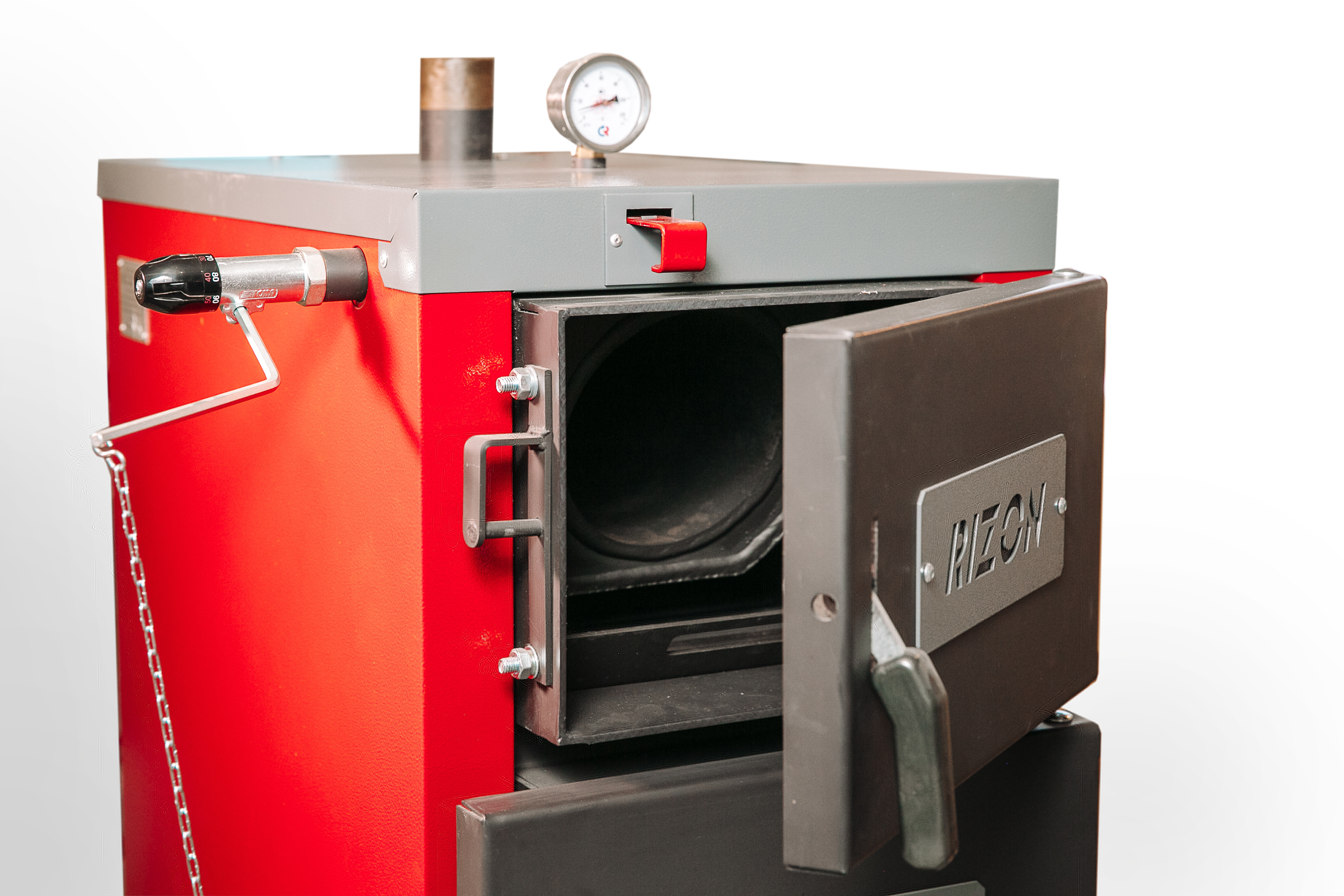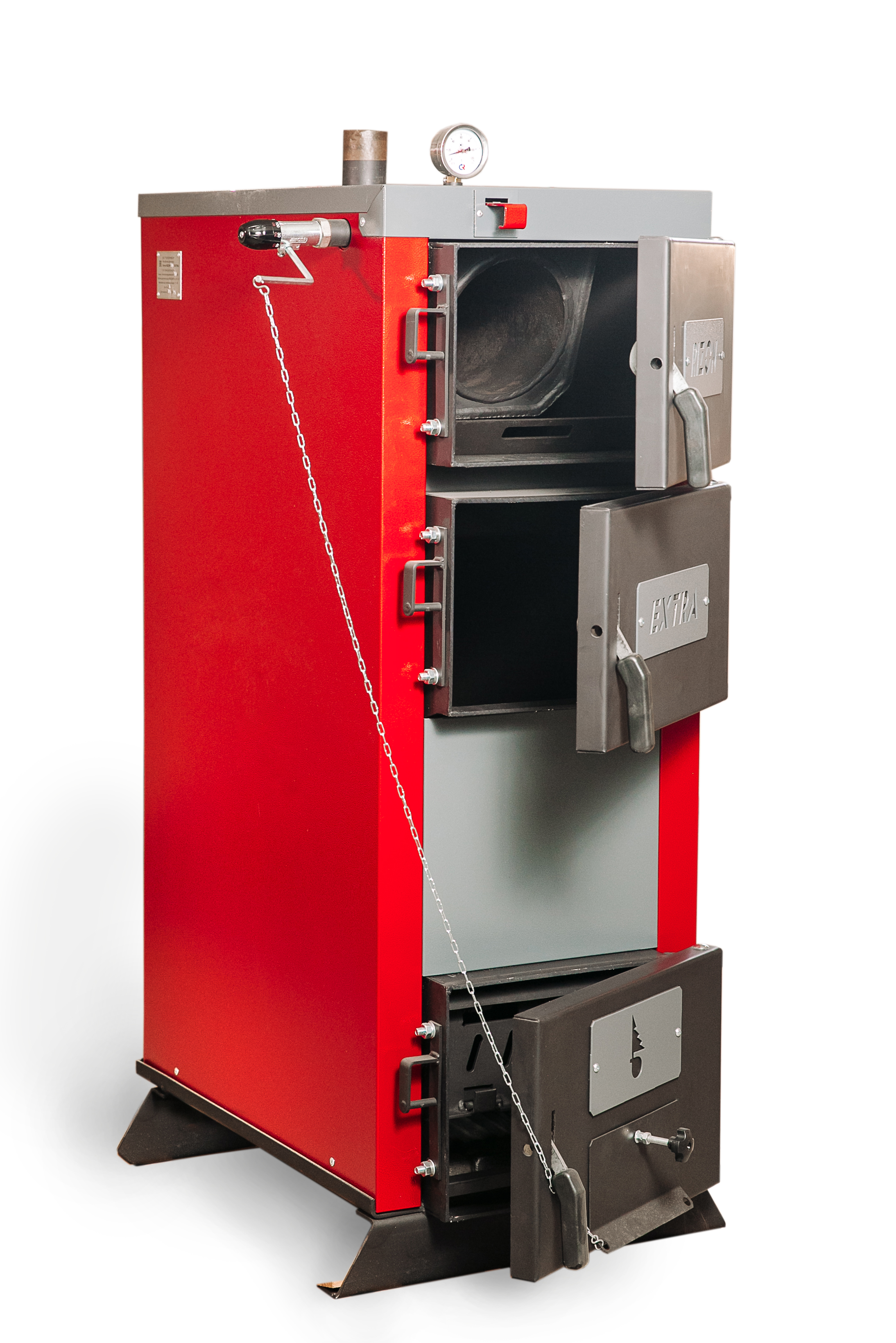 - Ступенчатая регулировка заслонки дымохода (шибера) с ручным управлением на лицевой стороне котла.